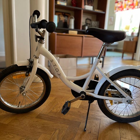 Merida barncykel med 16" hjul. Cykeln har ram i rosa och vitt med kedjeskydd, korg fram och pakethållare bak. Utrustad med grovmönstrade däck, reflexer och fotstöd. Passar barn som behöver en mindre cykel med 16-tums hjulstorlek.