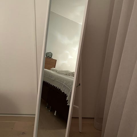 IKEA golvspegel i vit metallram. Spegeln står på golvet med ett fristående stativ. Baksidan har flera krokar för upphängning av exempelvis accessoarer eller kläder. Passar i sovrum, hall eller garderob för helkroppsspegling och enkel förvaring av mindre plagg eller tillbehör.