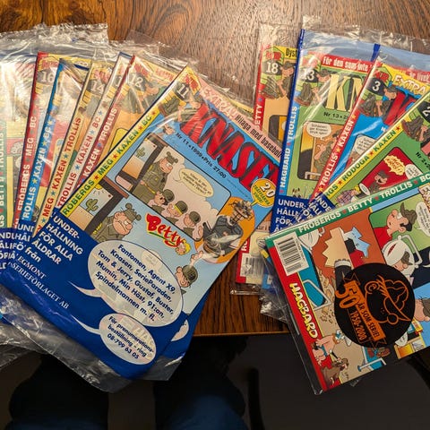 1 nr av Serieparaden (sista som gjordes) nr 6 år 2020. 2 nummer av Uti vår hage och 2 serieböcker, Uti vår hage och Lilla Fritjof.