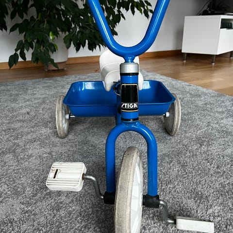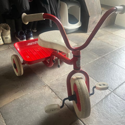 Barn trehjuling cykel. Modellen har röd ram, gröna detaljer och svart sits. Utrustad med skjutstång för att en vuxen ska kunna styra eller skjuta på, samt ett grönt tippflak baktill för att lasta leksaker eller andra småsaker. Pedaler på framhjulet och tre hjul ger stabilitet för mindre barn som lär sig trampa själva.
