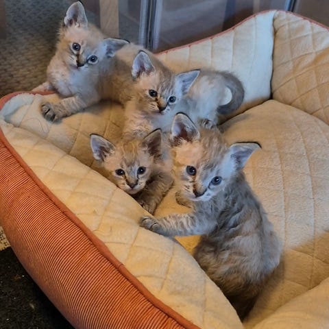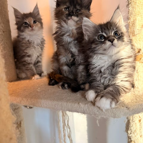 Den svartvita (Måns) och svart tabby (Aston) är två pojkar födda 16 februari 2026, medans den blåa (Leah) är en liten tjej som föddes en dag före sina bröder, alltså den 15 februari 2026.
