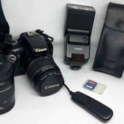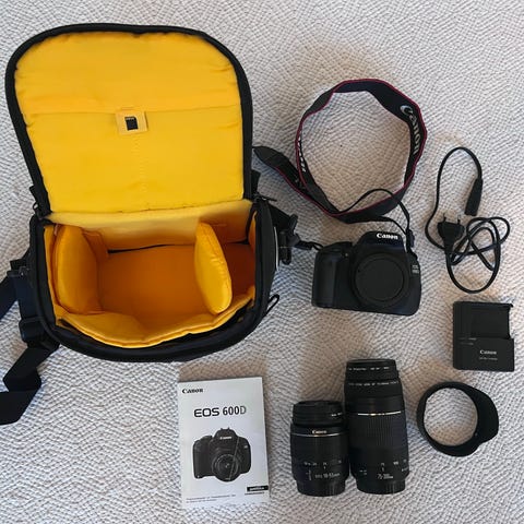Canon EOS 650D digital systemkamera med vridbar skärm och rem. Med följer objektiv och flera tillbehör som syns på bilderna, bland annat blixt och fjärrkontroll.