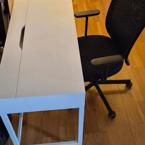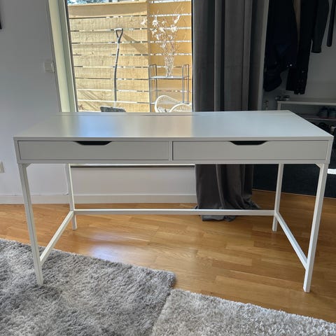 Varsamt använt vitt skrivbord. Två lådor fram och ett fack för sladdar baktill. Ben av metall.