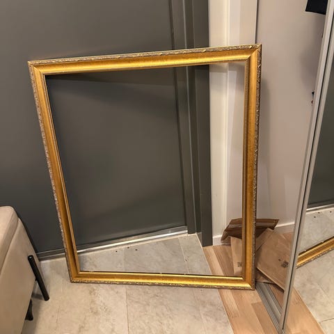 spegel med dekorativ guldram. Oklart vilket märke den kommer ifrån. Rektangulär spegel med profilerad ram i guldton och ornamenterade hörn och kanter. Passar exempelvis i hall, vardagsrum eller sovrum som väggspegel eller stående spegel mot vägg.