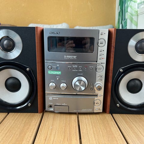 Kompakt stereosystem med snygg retrokänsla och träkabinett på högtalarna.