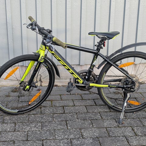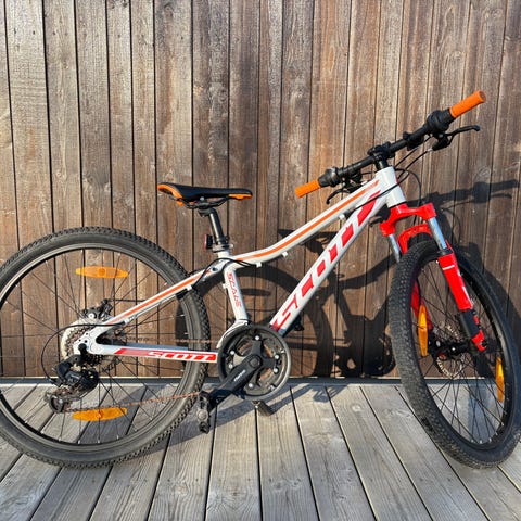 Scott barncykel med 24" hjul. Cykeln har blåvit ram och är utrustad med utanpåliggande växlar och handbromsar fram och bak. 18 växlar (3x6). Bra och stabil cykel. Använd, se bilder för skick. Hämtas i Karlshamn.