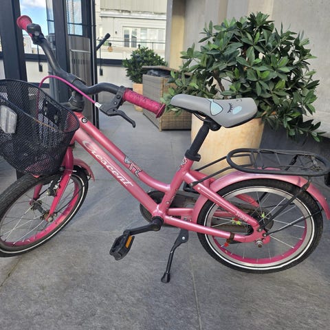 Crescent barncykel med 16" hjul i rosa färg. Cykeln har låg ram anpassad för barn, framkorg i metall, pakethållare bak samt kedjeskydd. Utrustad med fotbroms bak och handbroms fram. Sadeln är justerbar i höjd för att passa växande barn. Lämplig som första större cykel för barn som växer ur mindre hjulstorlek.