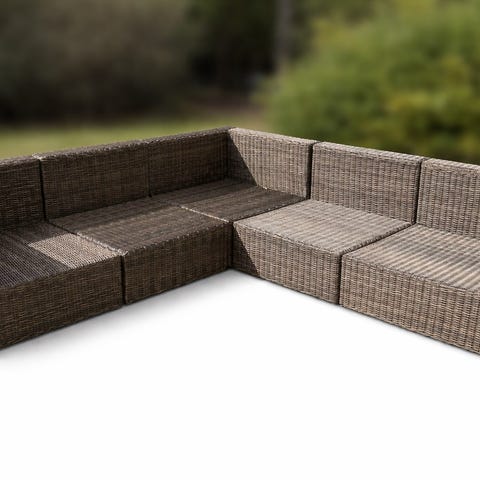 Hörsoffa för utomhusbruk i grå konstrotting med lösa sitt- och ryggdynor. Består av flera moduler som kan ställas ihop till hörnsoffa eller separeras efter behov. Passar exempelvis balkong, altan eller uteplats. Dynorna är tjocka och ger stöd för både rygg och sittdel. Stommen är i flätad konstrotting som är anpassad för utomhusmiljö.