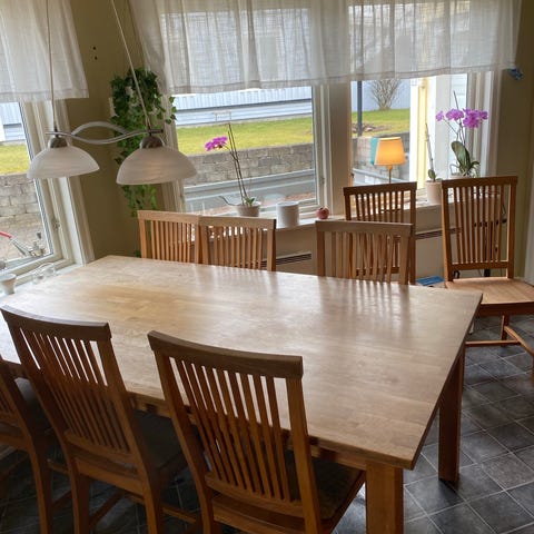 Dessa sex furustolar tillverkades av Bo Bågling i Hammaredal, Jämtland, på början av 70-talet och är precis lika stabila och sköna idag som då. Stolarna har en del repor och färgskiftningar i ffa några sitsar, vilket enkelt döljes med kuddar. För den händige går det såklart utmärkt att fräscha upp det massiva träet. Hög rygg gör att man sitter bra. Väl tilltagen sits.