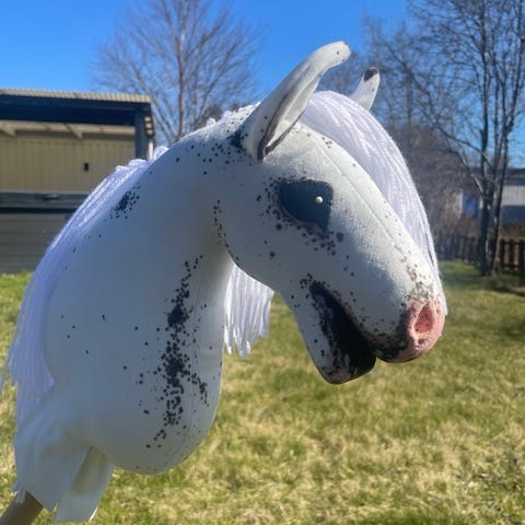 Pebbles är helt vit. Pebbles är sydd av mig under 2024, han har mest stått och inte blivit riden. Helt nyskick och inga defekter eller likande, helt rak. Vadd och berlock ingår! OBS! Fraktas utan pinne. Köparen står för frakten. Instagram: srb_kapphastar1