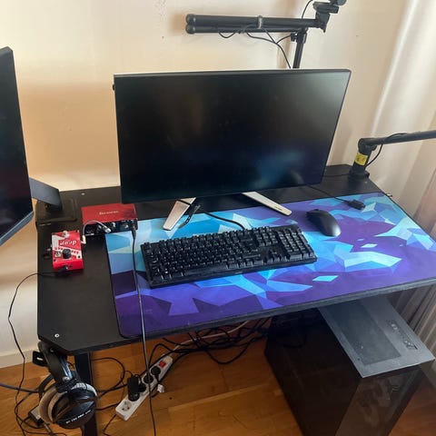 Svart skrivbord / gaming bord i mkt bra skick. En plastgrej på baksidan av ena benet är borta, inget som stör funktionen eller syns om bordet står mot något. Inga repor på skivan.