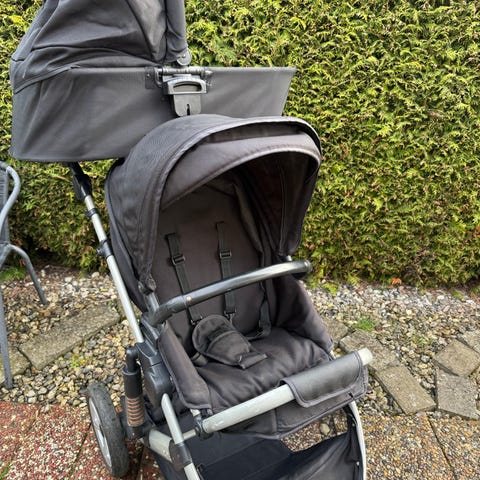 Vagnen har två separata sittdelar bredvid varandra med individuella suffletter. Utrustad med framåtvända sittplatser, fempunktssele och avtagbara frontbyglar. Stora hjul framtill och baktill ger stabil körning. Justerbart handtag baktill. Passar två barn åt gången, exempelvis tvillingar eller syskon i liknande ålder.