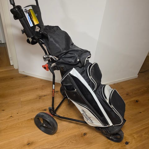 Golfbagen har flera fickor och dragkedjor för förvaring av tillbehör. Lämpligt för spelare som söker ett komplett set med både järn och trä för spel på bana eller träningsområde.