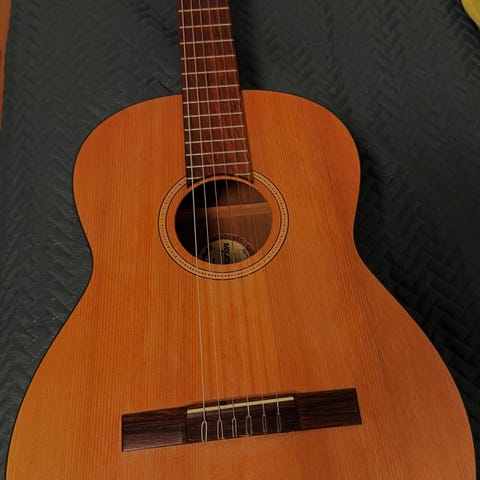 Vet inte mycket om denna gitarr, men vad jag själv kommit fram till är att det verkar vara en solid spruce top och (förmodligen) laminat back&sides av flamed maple.