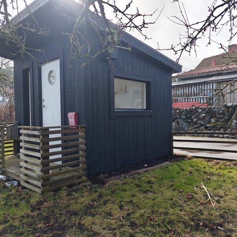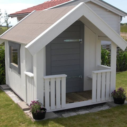 Framför ingången finns en liten veranda med räcken och sittbänk. Passar som lekstuga i trädgård eller som mindre förrådsutrymme.