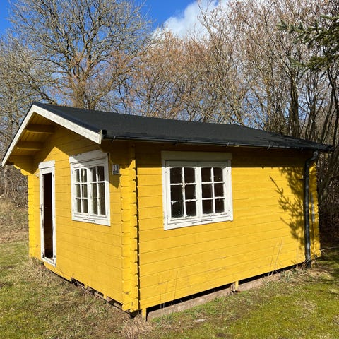 Lekstuga / redskapsbod i trä målad i gult med vita detaljer.