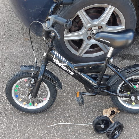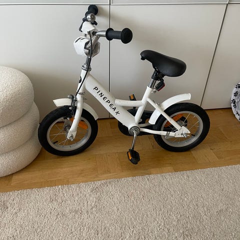 Barncykel Biltema Yosemite med 12" hjul i rosa färg. Utrustad med stödhjul, kedjeskydd och reflexer.