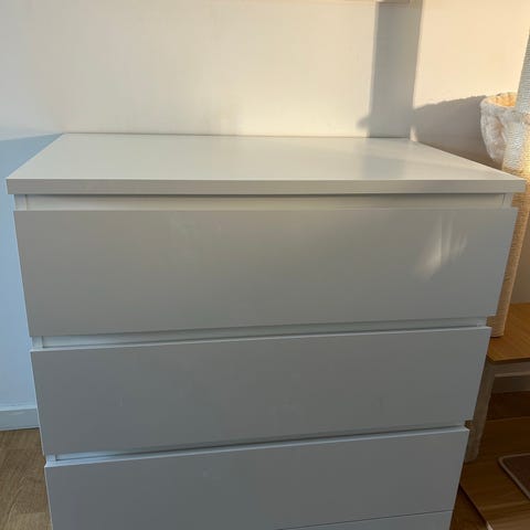 IKEA MALM nattduksbord/byrå med två lådor i vitt utförande. Enkel och stilren design som passar i de flesta sovrum.