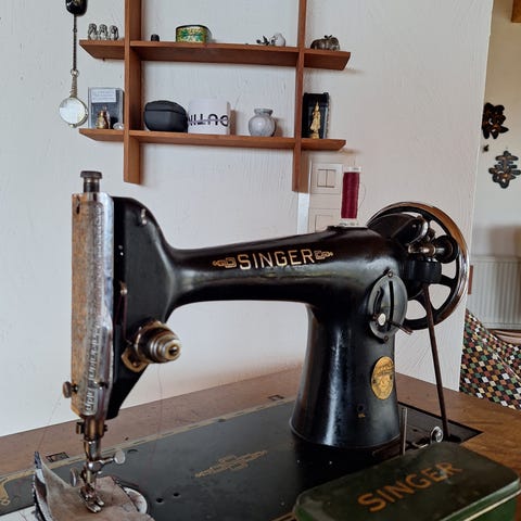 Singer symaskin med original trampbord i trä och underrede i gjutjärn. Maskinen är monterad i ett bord med träskiva, utdragslåda på sidan och avtagbart trähölje/lock märkt Singer. Trampfunktionen drivs med fotpedal och remhjul. Dekorerad maskinkropp i svart metall med mönster och Singer-logotyp. Passar som fungerande symaskin om den servas samt som inredningsdetalj eller samlarobjekt.