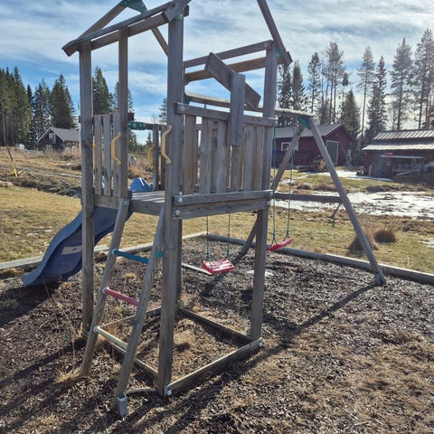 Överliggare till gungställning med fästen för tre gungor samt ett fäste för rep. Metallfäste för nedåtgående balkar. Balkarna ingår ej, dock tvärslå om så önskas.