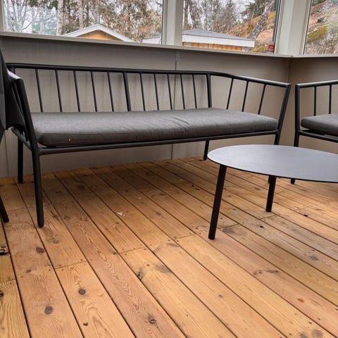 Säljer ett stilrent Loungeset/balkongset i rostskyddsbehandlat stål. Köpt i juli 2025 och endast använt i cirka en månad. En bänk, två fåtöljer med dynor och två runda bord. Säljes på grund av att balkongen är för liten.