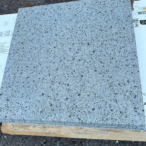 Kakel plattor i gråbeige ton med tydlig ådring och stenstruktur. Plattorna är rektangulära, cirka 60 x 60 cm enligt måttbandet på bilderna. Ytan har ett naturstensmönster med inslag av ljusare och mörkare partier. Passar exempelvis till golv, vägg eller trappsteg inomhus eller utomhus beroende på läggningsmiljö och behandling. Säljs som hela plattor enligt bilderna. Priset 200 kr. for alla.