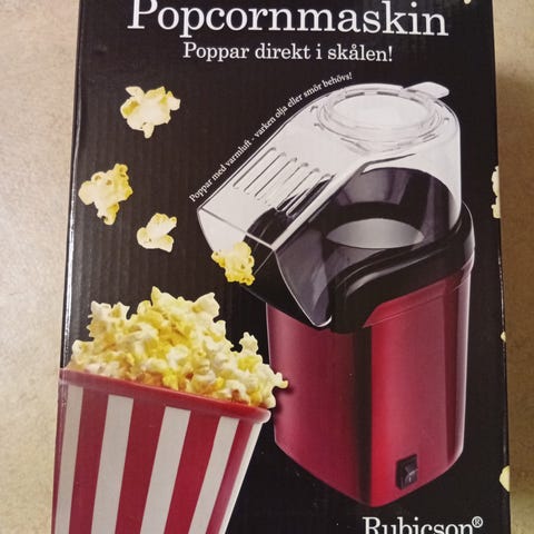 Het luft-popcornmaskin från OBH Nordica. Använd en gång, i princip nyskick. Ingen olja behövs.
