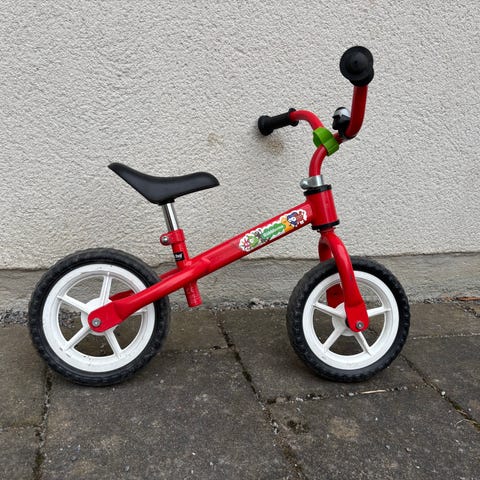 Springcykel med 10” hjul i blå färg med gula fälgar. Passar för mindre barn som ska öva balans och cykling utan trampor.