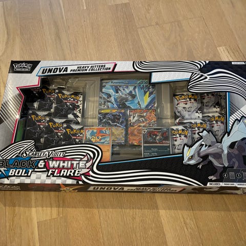 Pokémon TCG: Unova Heavy Hitters Premium Collection är en exklusiv samlarbox som lyfter fram några av de mest eftertraktade Pokémon från Unova-regionen. Boxen innehåller kraftfulla promo-kort med Zekrom ex, Reshiram ex och Kyurem ex, samt totalt 12 booster packs från Scarlet & Violet – Black Bolt och Scarlet & Violet – White Flare.