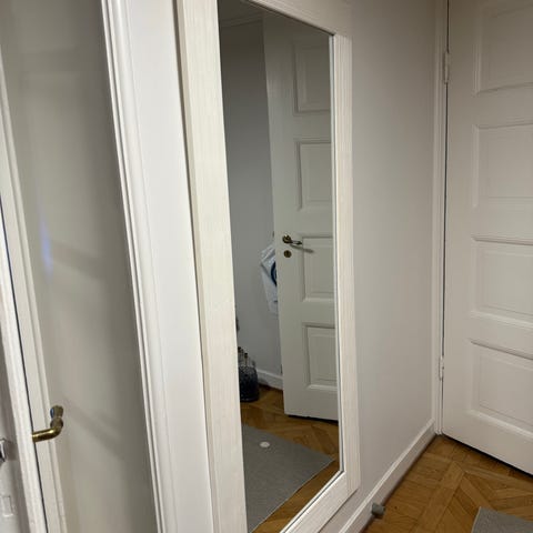 IKEA spegel i helkroppsmodell med ram i trä. Spegeln är rektangulär och kan användas i hall, sovrum eller vardagsrum för helkroppsvisning och som inredningsdetalj. Kan monteras på vägg beroende på önskat läge och utrymme.