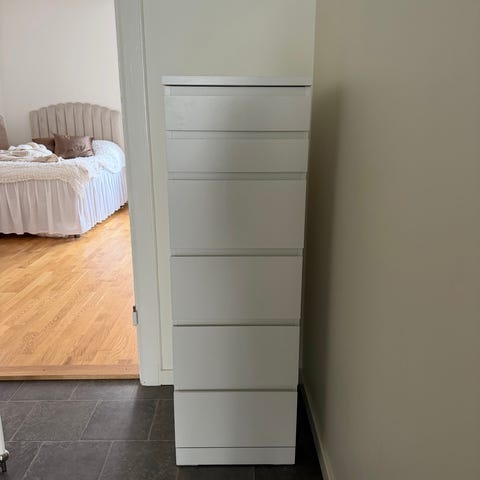 IKEA byrå i vit färg med 6 rymliga lådor. Byrån har en enkel, rak design med slät front utan synliga handtag. Passar för förvaring av kläder, textilier eller andra saker i sovrum, hall eller vardagsrum. Ytan är slät och lätt att torka av. Möbeln är fristående och placeras mot vägg.