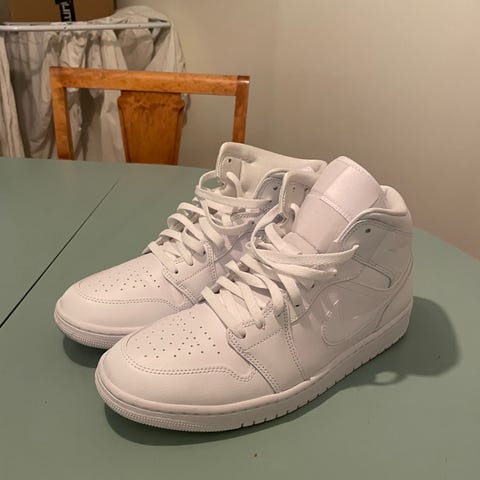 Air Jordan sneakers i storlek 44. Modellen är höga sneakers i vit färg. Ovandel och detaljer i syntet/läderliknande material med snörning framtill. Yttersula i gummi med mönstrad undersida för grepp. Passar som vardagsskor eller till fritidsaktiviteter. Herrmodell enligt märkning i skon (US 10/UK 9/EUR 44).