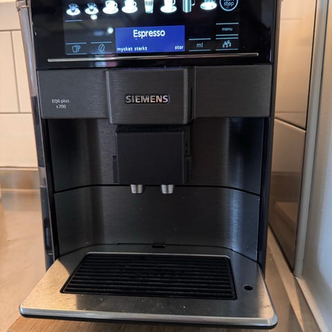 Siemens eq6 plus s100 helautomatisk espressomaskin. Maskinen har inbyggd kvarn för hela bönor, frontpanel med display och knappar för olika kaffedrycker samt justerbart kaffeutlopp. Utrustad med ångrör för mjölkskumning och varmvatten, droppbricka och avtagbar vattenbehållare. Passar för bryggning av espresso, kaffe och andra varma drycker i hem- eller kontorsmiljö. Har alltid rengjorts enligt siemens manuall , funkar felfritt.