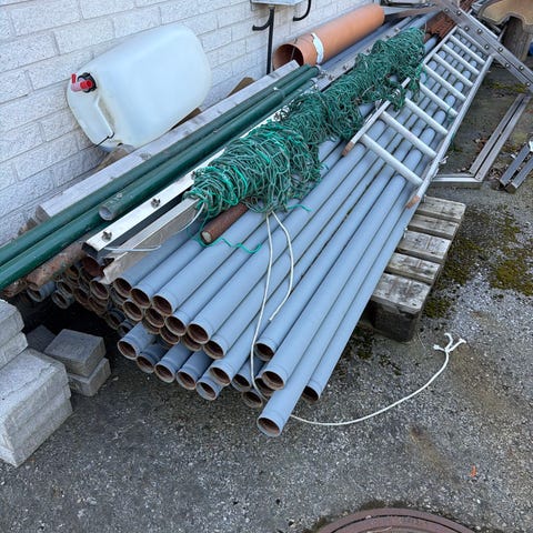 Över blivet vvs material efter renovering. Prisolrör 12 o 15 mm, golvbrunnar, purusplattor, avloppsxdetaljer, kopplingar mm
