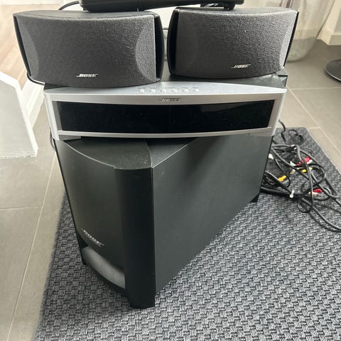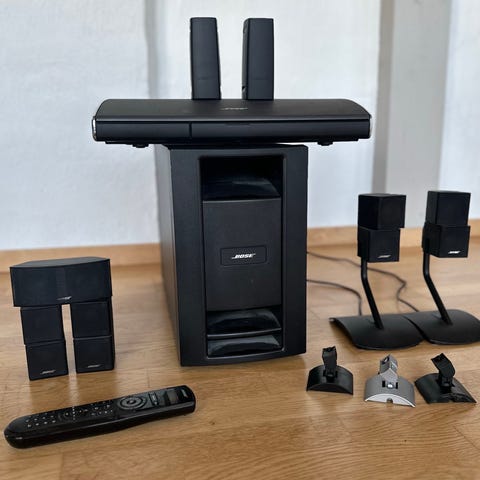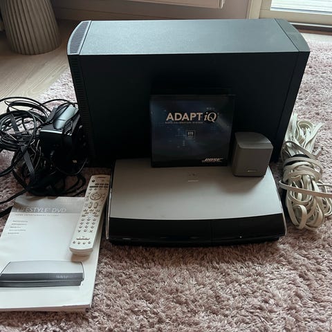 Bose Lifestyle 235 Series II högtalarsystem i vitt utförande. Systemet består av en vit basmodul, två vita satellithögtalare, en svart kontrollkonsol samt fjärrkontroll. Bruksanvisningar för systemet ingår. Avsett för hemmabruk som komplett ljudsystem för tv, film och musikuppspelning. Anslutningar och exakta tekniska specifikationer framgår av medföljande manual.