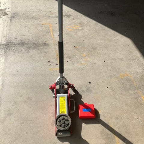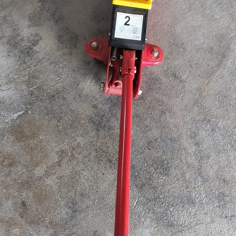 Domkraft i använt, bra skick. Maxkapacitet 2 ton. Två pallbockar ingår - de tål 3 ton per styck.