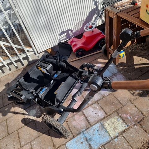 En jättebra ståbräda från Stokke! Den är enkel att sätta på barnvagnen, och är inte lika mycket ivägen som stora breda brädor. Den är kul också då den ser ut som en skateboard.