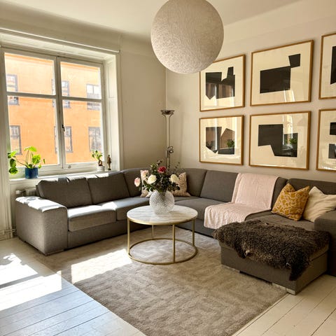 Mellanrum mellan divan och schäslong är 160 cm (Bredd för soffbord).