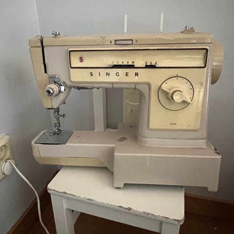 Väldigt stabil maskin i metall som syr jämnt och klarar även tjockare material utan problem.