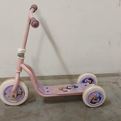 Trehjulig sparkcykel för barn i rosa och vitt. Modellen har två hjul bak och ett fram för extra stabilitet. Utrustad med styre med handtag, fotplatta med halkskydd samt liten korg framtill för mindre saker. Passar yngre barn som vill öva balans och koordination utomhus på plana underlag.