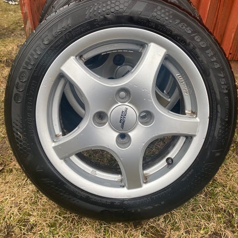 4 st sommardäck på ALU fälgar. Däcken köptes nya och monterades i mitten på Juli 2025. Har rullat ca: 200 mil. De har suttit på en Peugeot 107 årsmodell 2012. 4 st Alu fälgar något slitna.