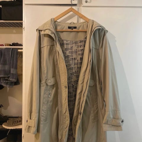 Fin damjacka, nästan ny i 100% suede spalt läder. Storlek 44. Dragkedja fram, också på 2 fickor och på ärmarna. Färg ljusbeige. Fodret I ryggen 35% bomull och 35 % polyester, i övrigt 100% polyester. Längd 62 cm, ärmlängd 62 cm, bröstvid 108 cm. Pris 150 kr. Kan skickas eller hämtas I Göteborgs centrum.