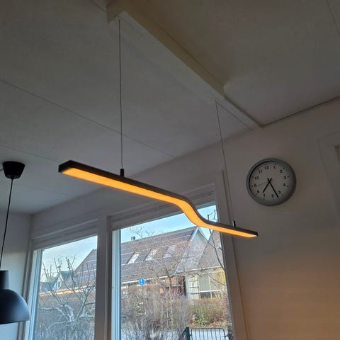 Taklampan består av flera skärmar monterade på en lång horisontell stång, upphängd i tunna vajrar.