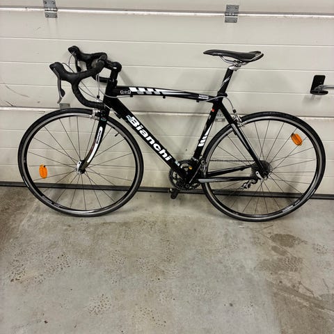 Nishiki 005 Road Race racer med aluminiumram i storlek M. Cykeln har bockstyre med dubbla bromshandtag och växelreglage integrerade i handtagen. Utrustad med smala landsvägsdäck och snabbkoppling på hjulen. Ramen är huvudsakligen vit med svarta detaljer och Nishiki-logotyp på sidan. På styret sitter en enklare cykeldator monterad. Lämplig för landsvägscykling och pendling på asfalt.
