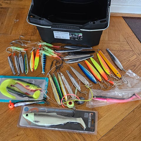 Massor av havsöring drag ,jiggar till havsfiske,gäddfiske och mycket annan utrustning. Krokar,lekare,tafsar mm. Utrustning för 5000 kr + säljes för att min kropp inte klarar av fiske mer. Ett jätte tillfälle.