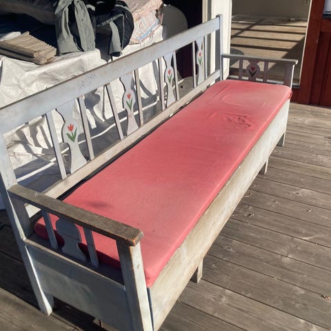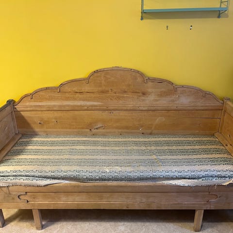 Kökssoffa som använts som sänggavel. Saknar ”sofflocket” Lackad.