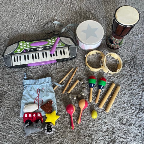Musikinstrument / leksaksset för barn. Setet innehåller en fin trumma, xylofon i trä med färgade metallplattor och klubbor, maracas, blockflöjt, munspel samt leksakssaxofon. Passar för barn som vill prova olika rytmer och toner och utforska enkla musikinstrument. Alla 6 för 100kr totalt.