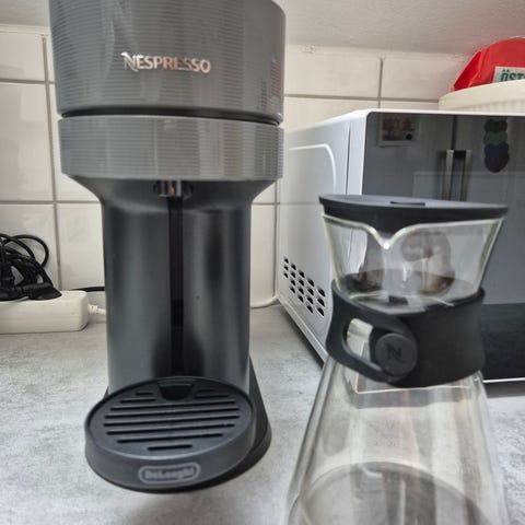 Nespresso Vertuo Pop kaffemaskin i svart och grå färg. Maskinen använder Nespresso Vertuo-kapslar och brygger kaffe i olika koppstorlekar beroende på kapseltyp. Utrustad med avtagbar vattentank på baksidan och droppbricka framtill. Kompakt modell som passar på mindre bänkyta i kök eller kontor.