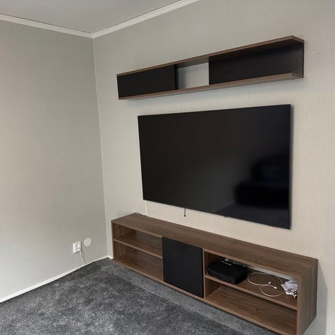 Tv-bänk 180 bred, 40 hög, 42,5 djup. Går att ha både ståendes eller upphängd.