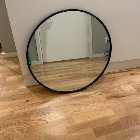IKEA Lindbyn rund spegel med tunn svart ram. Väggmonterad spegel som passar i exempelvis hall, sovrum eller badrum. Enkel, modern design med rund form och diskret ram som ger en neutral och funktionell spegelyta i rummet.